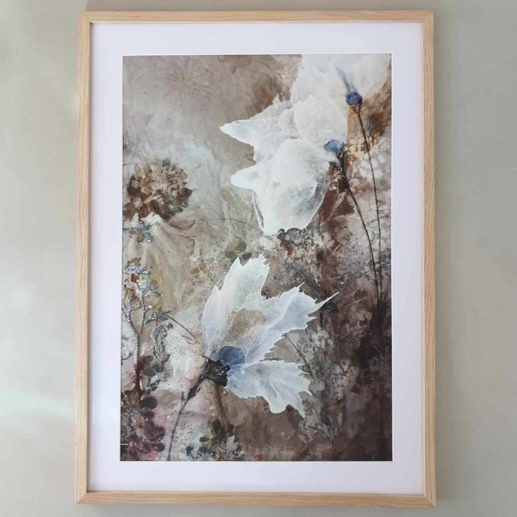 Kunstplakaten er isat en massiv egetræsramme med passepartout, der står flot til de naturfarver, der optræder i værket. Rammen måler 50 x 70 cm. og det samme gør kunstplakaten. Du kan derfor også vælge at undlade passepartoutet.