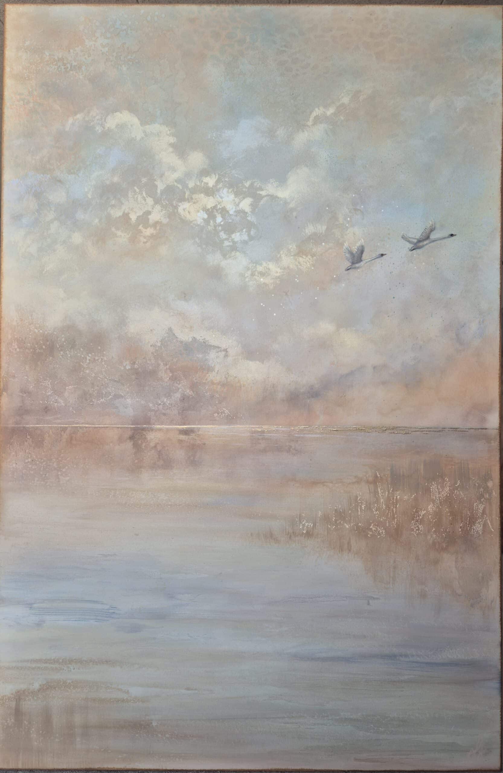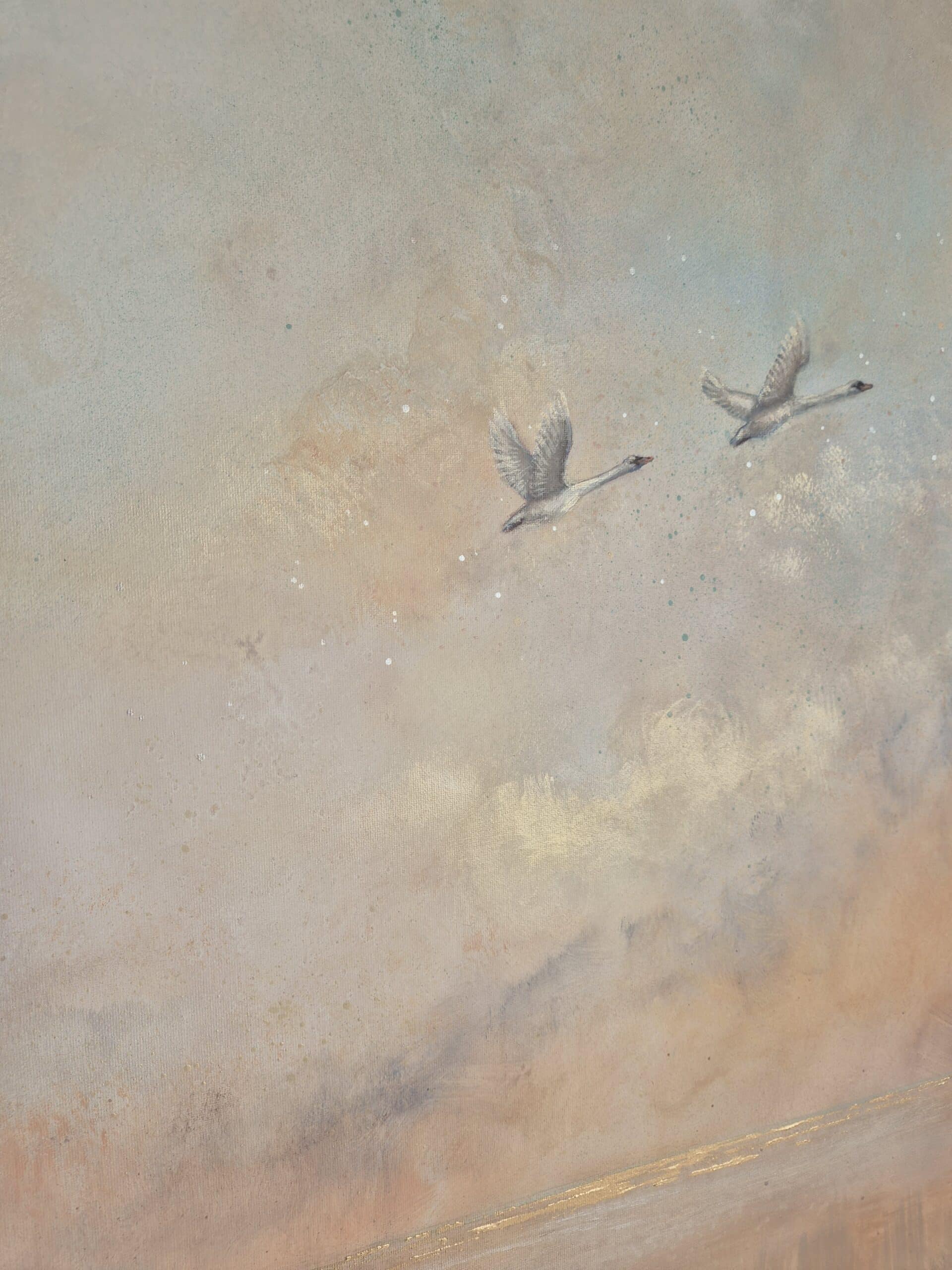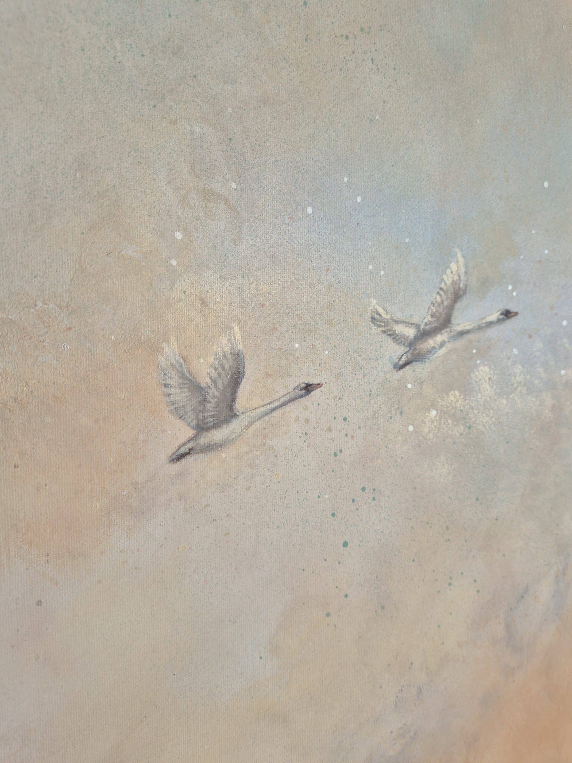 “Maleriet er inspireret af alle de uhyrsmukke og eventyrlige solnedgange her ved fjorden, som jeg kan se fra atelieret og galleriet. Dagligt kommer der svaner svømmende og flyvende forbi og jeg er så fascineret af disse yndefulde skabninger, at jeg bliver nødt til at male dem. Derudover symboliserer svaner blandt andet styrke, lys, ro og indre skønhed. Symbolikken hænger derfor så fint sammen med mine levende landskabsmalerier og hvad jeg ønsker at give videre med min kunst.
