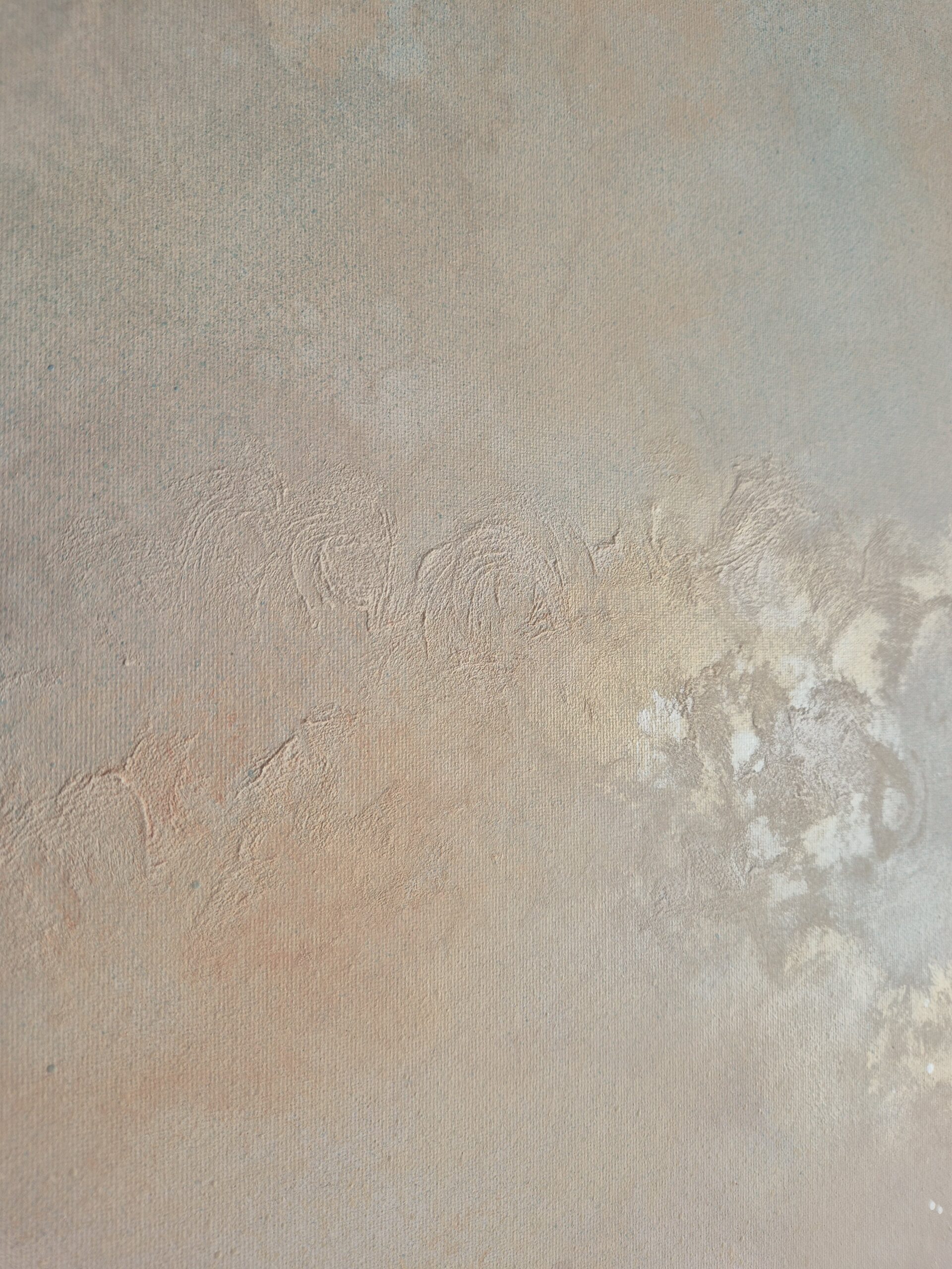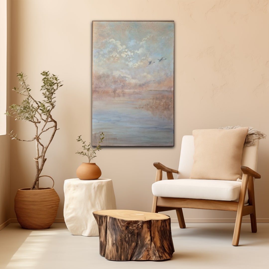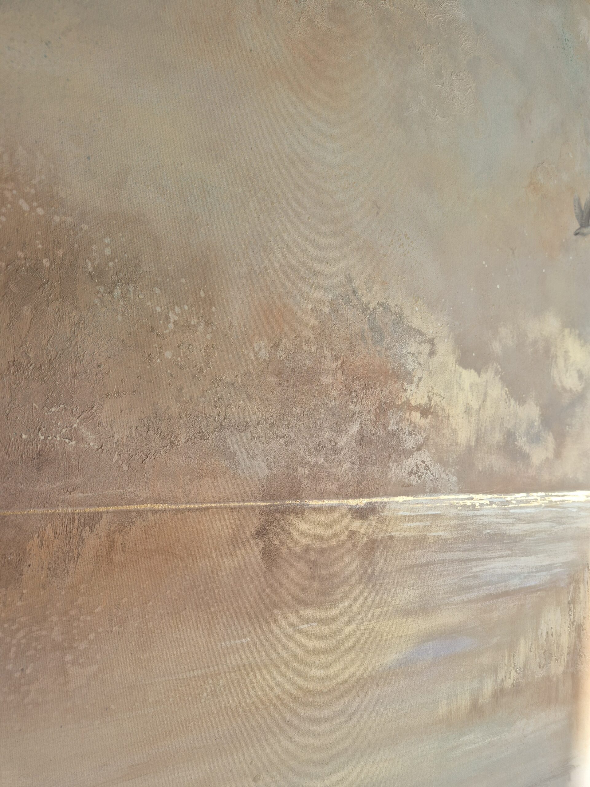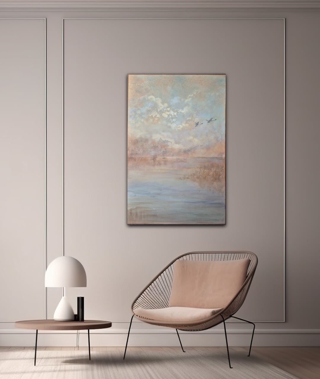 At maleriet, for mig, både skaber ro, byder på fordybelse og eventyr, skyldes, at værket ændrer karaktér og udtryk i løbet af dagen – præcis som de smukke himle jeg er så betaget af. Det magiske univers, jeg forsøger at skabe og bringe indenfor hos mine kunder, bliver helt tydelig, når lys rammer de changerende og lysreflekterende effekter fra forskellige vinkler. For mig gør det et maleri som dette magisk og levende. Det minder os om lige at stoppe op, trække vejret og nyde nuet.”