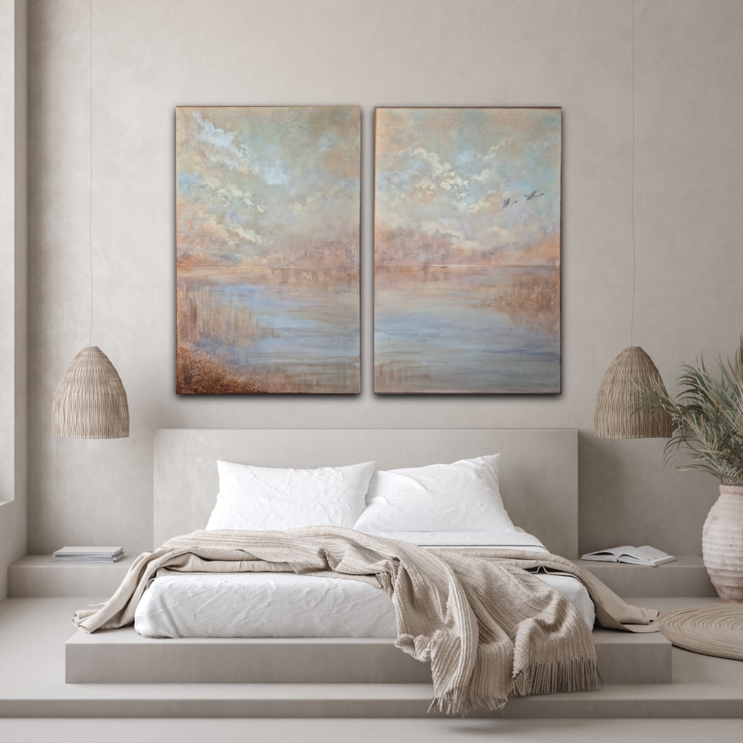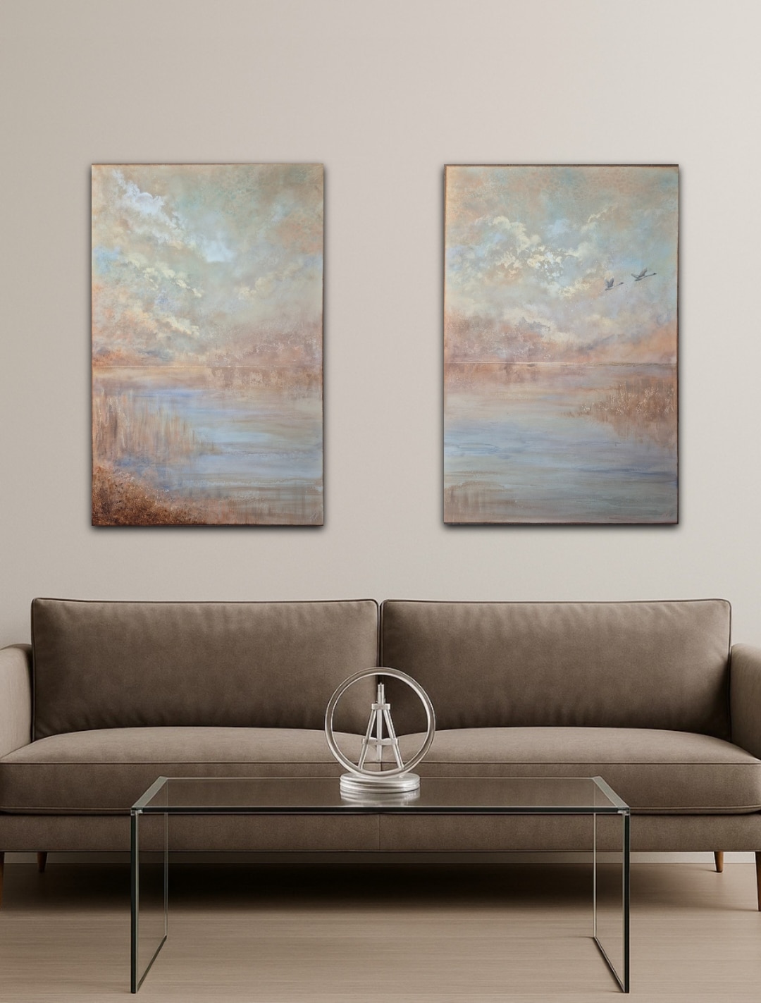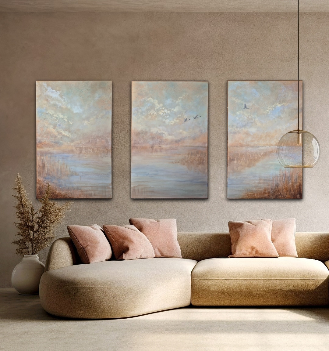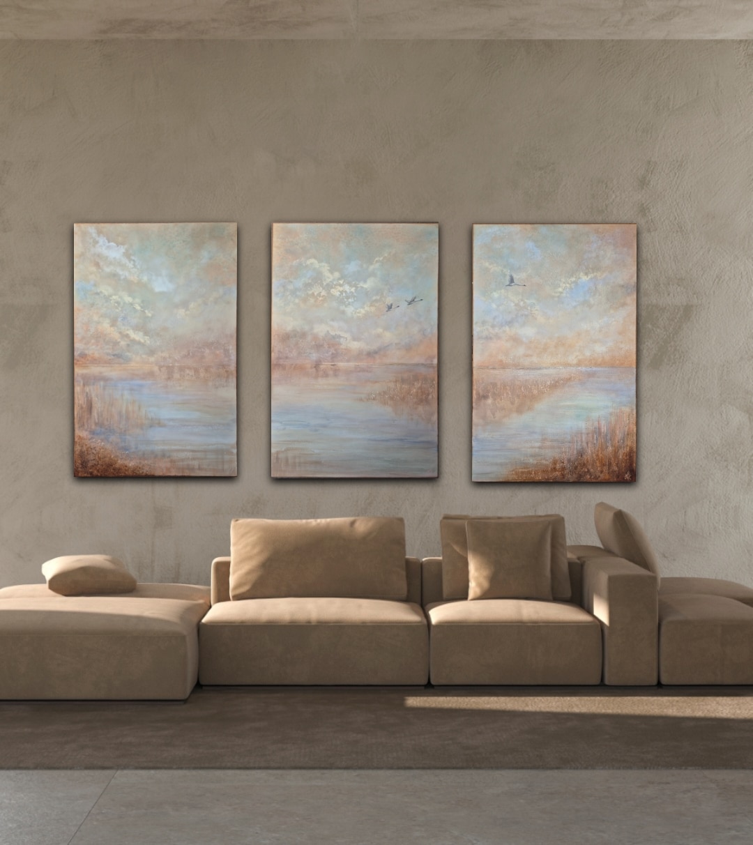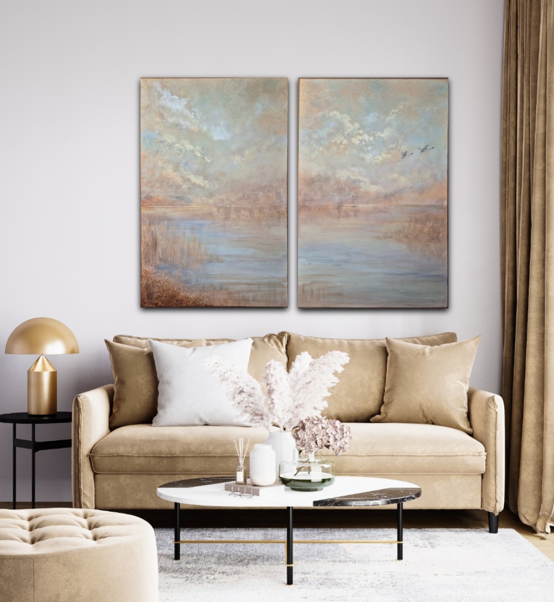 De harmoniske, lysende og rolige landskabsmalerier skaber uendelige magiske øjeblikke med alle de lysreflekterende og changerende detaljer i guld og perlemor. Når lyset rammer eller du tænder en lampe, opstår magien og de fine detaljer begynder at danse på lærredet. Forbered dig på at opdag nye lag i malerierne hver dag.