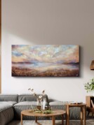 Dyk ned i en verden af en mystisk, gylden tåge, ro og eventyr med dette harmoniske, originale maleri – et betagende abstrakt værk, der vil tilføje en fortryllende atmosfære til dit hjem. Kunstværket er malet i gyldne og lilla og lyseblå og lysegrå toner, der skaber en dybdegående og beroligende palet, som er perfekt til at skabe en følelse af ro og harmoni i ethvert rum.