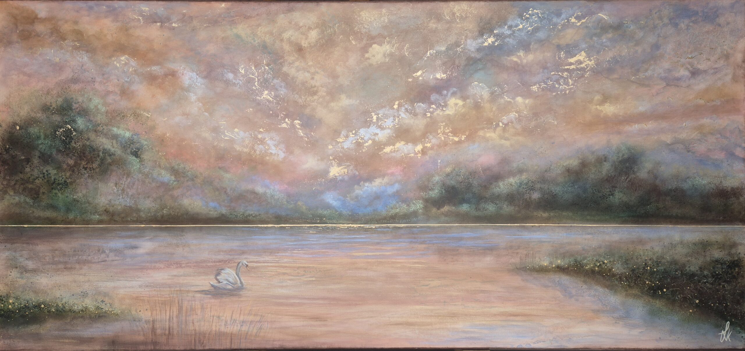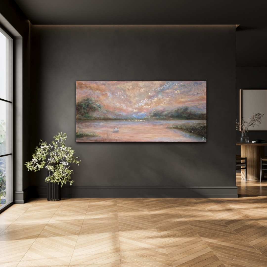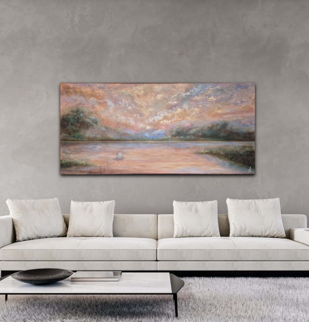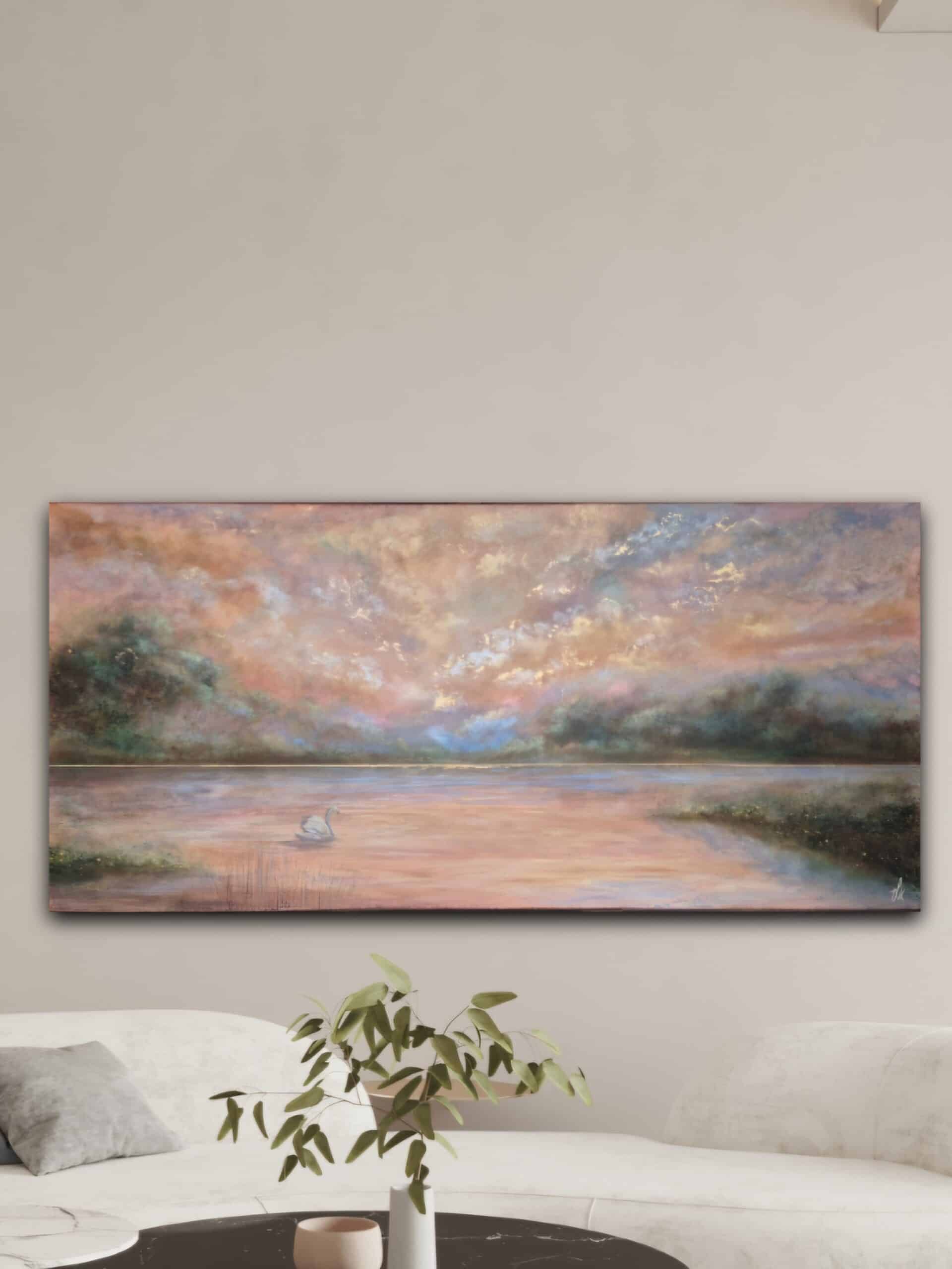 “Guided by the Light” er et stort, liggende svanemaleri i harmoniske farver, der skaber ro og magi i indretningen.