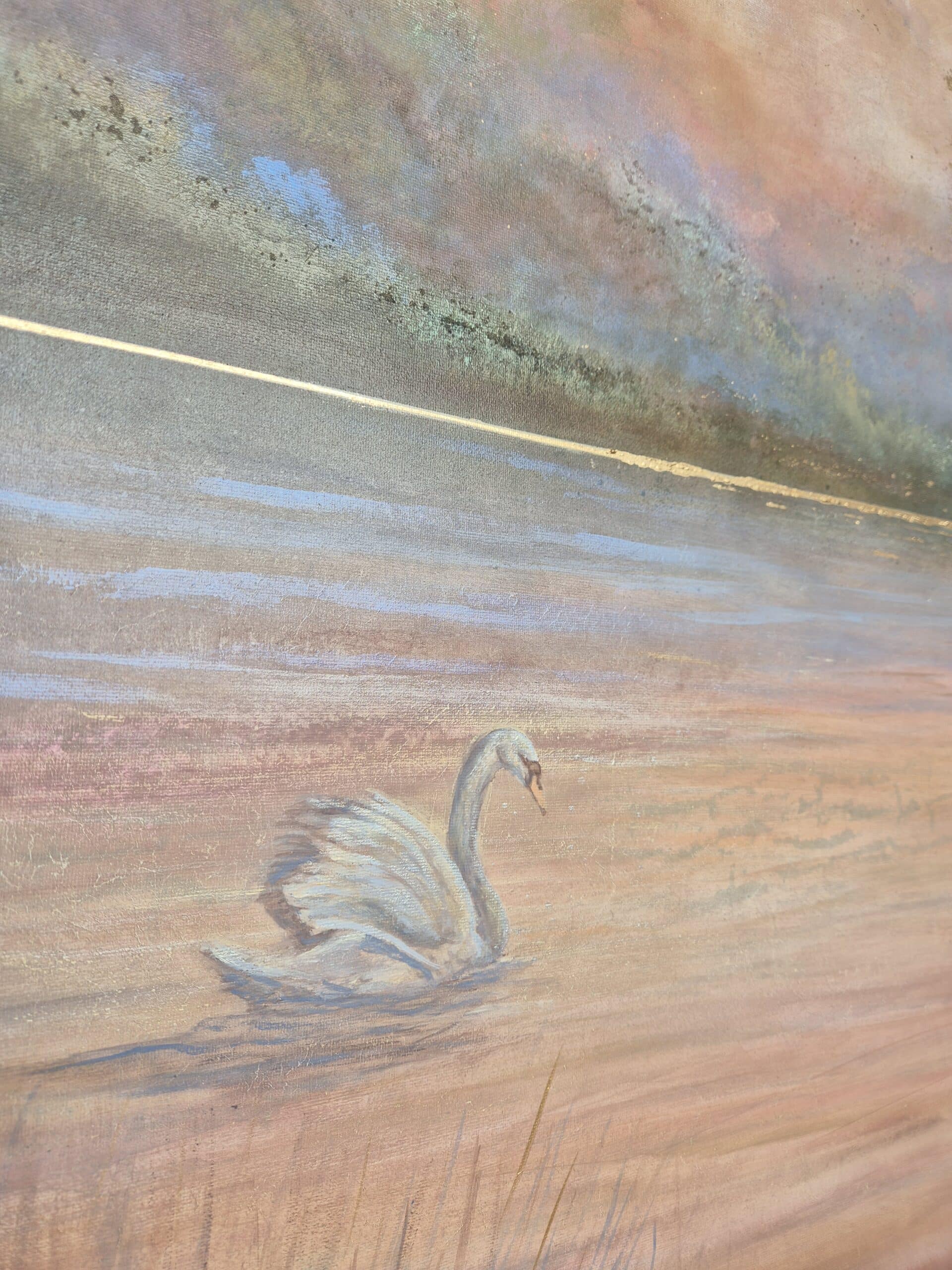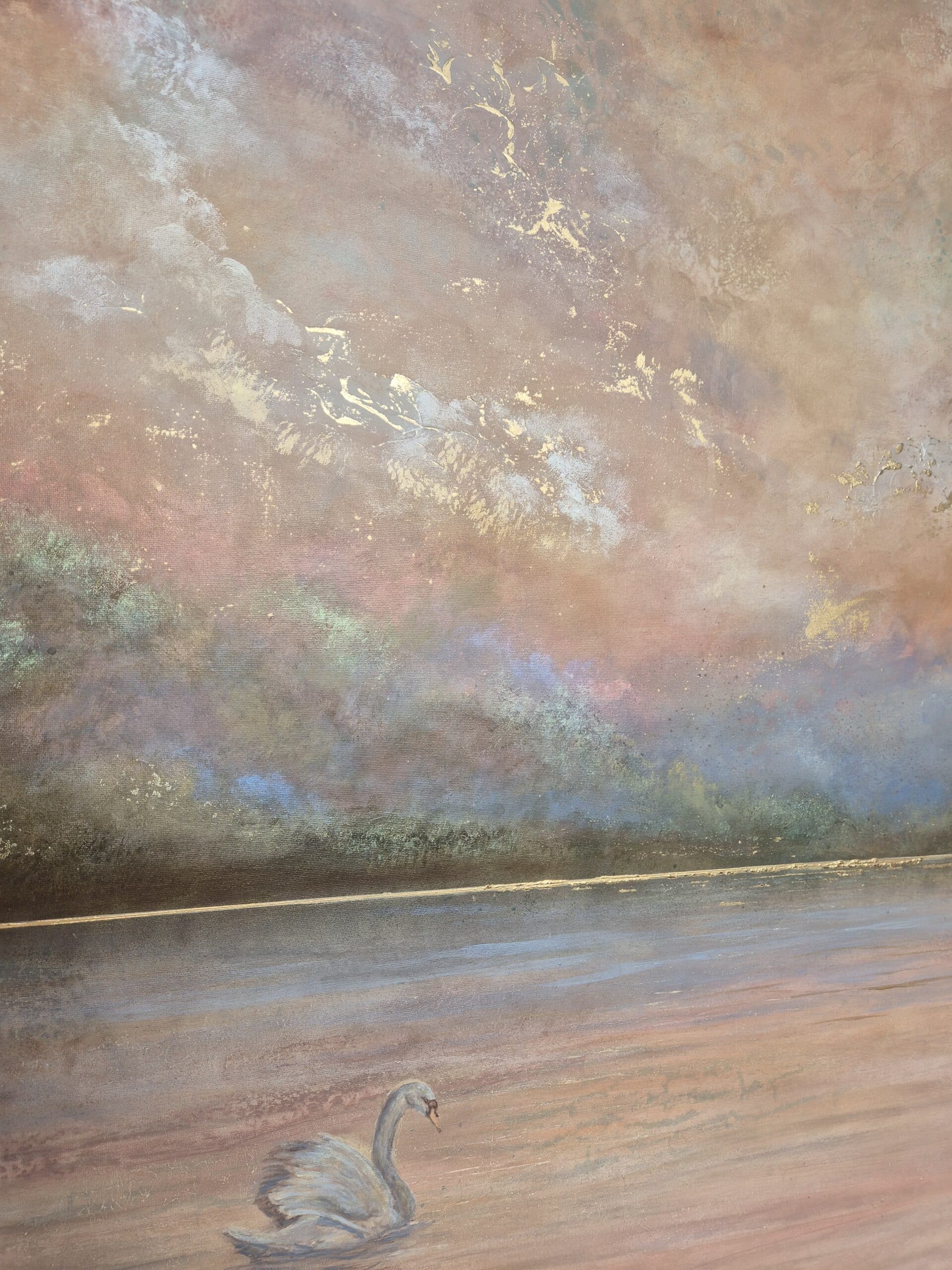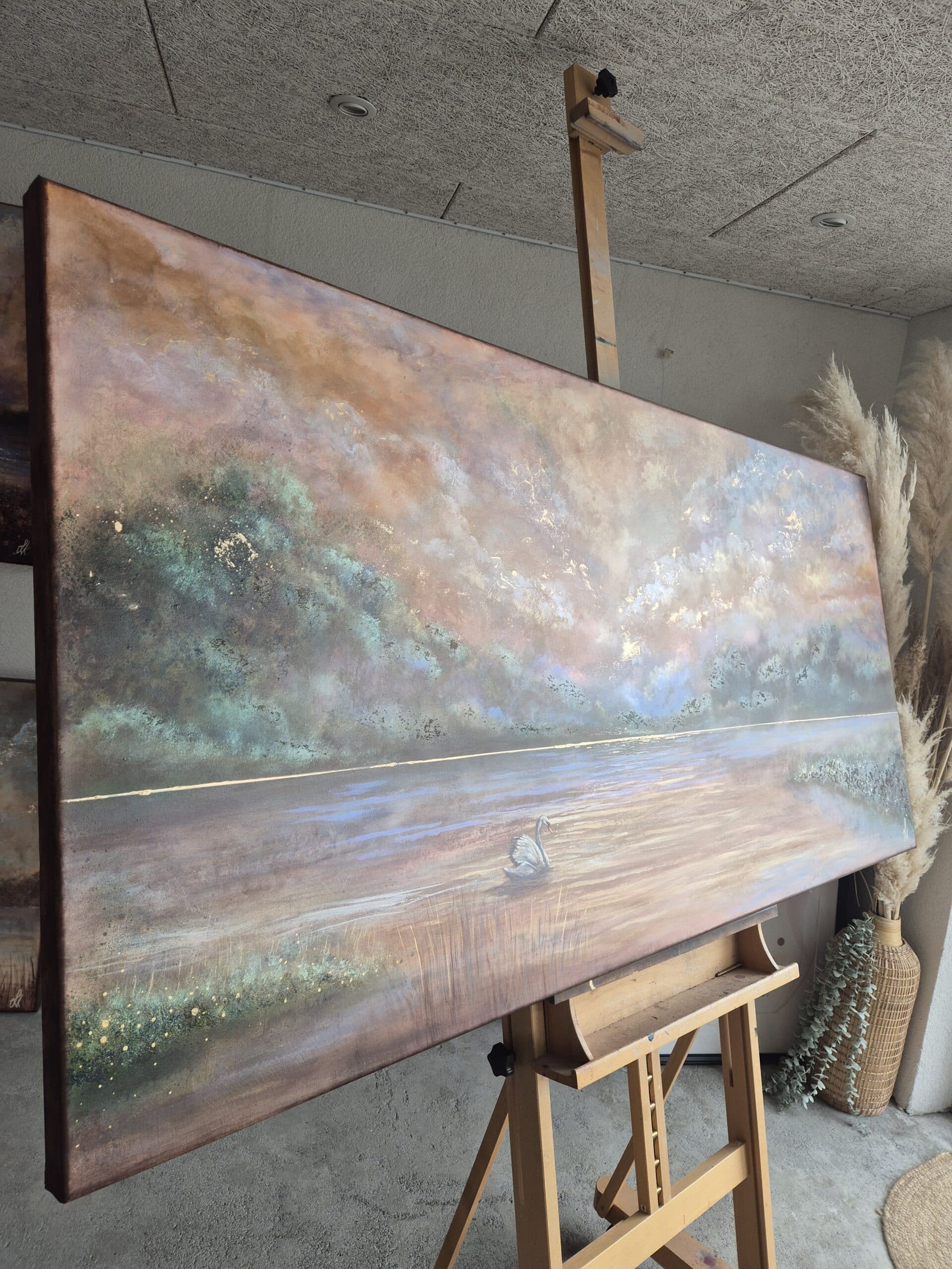 Maleriet er inspireret af alle de uhyrsmukke og eventyrlige solnedgange her ved fjorden, som jeg kan se fra atelieret og galleriet. Dagligt kommer der svaner svømmende og flyvende forbi og jeg er så fascineret af disse yndefulde skabninger, at jeg bliver nødt til at male dem. Derudover symboliserer svaner blandt andet styrke, lys, ro og indre skønhed. Symbolikken hænger derfor så fint sammen med mine levende landskabsmalerier og hvad jeg ønsker at give videre med min kunst.