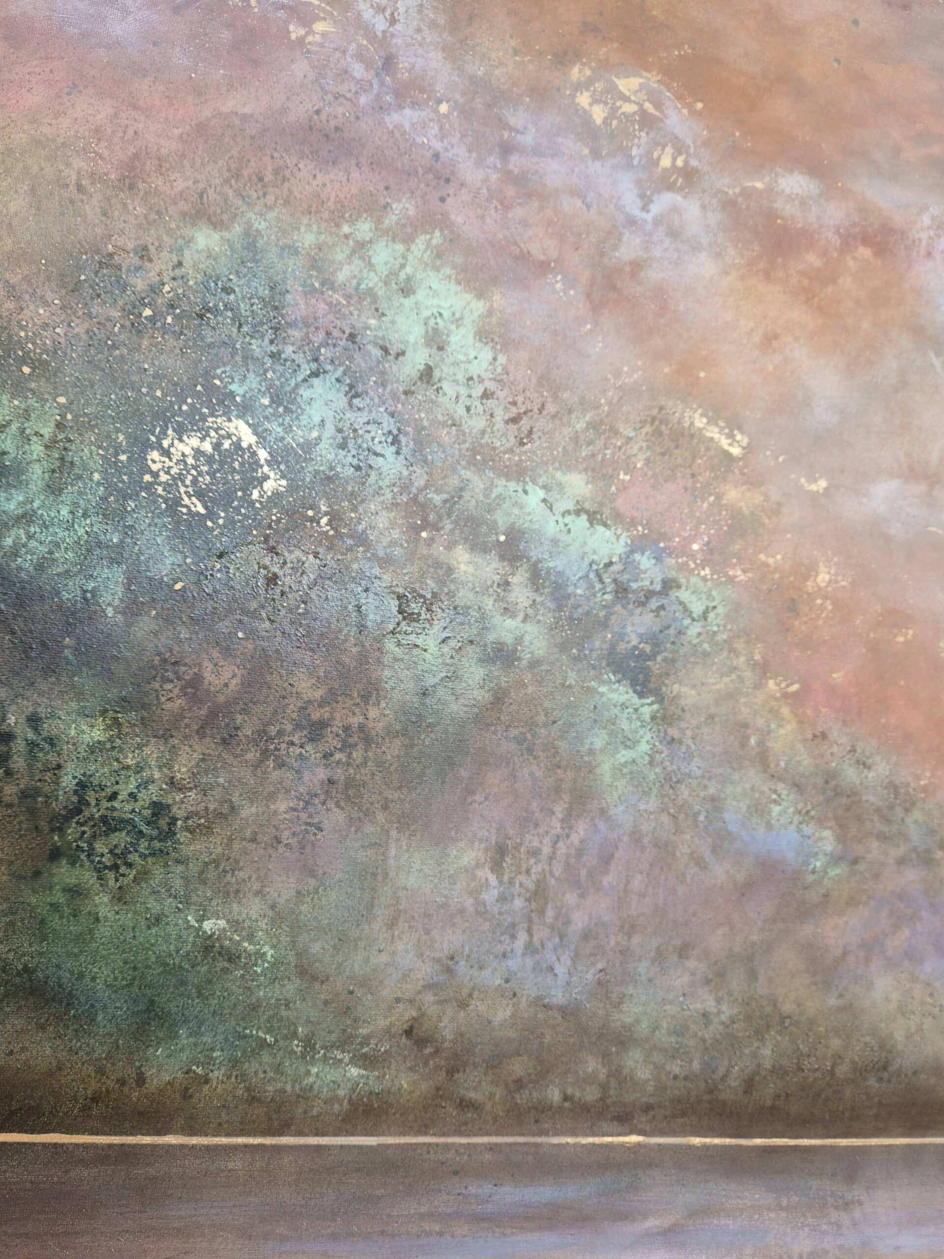 At maleriet, for mig, både skaber ro, byder på fordybelse og eventyr, skyldes, at værket ændrer karaktér og udtryk i løbet af dagen – præcis som de smukke himle jeg er så betaget af. Det magiske univers, jeg forsøger at skabe og bringe indenfor hos mine kunder, bliver helt tydelig, når lys rammer de changerende og lysreflekterende effekter fra forskellige vinkler. For mig gør det et maleri som dette magisk og levende. Det minder os om lige at stoppe op, trække vejret og nyde nuet.”
