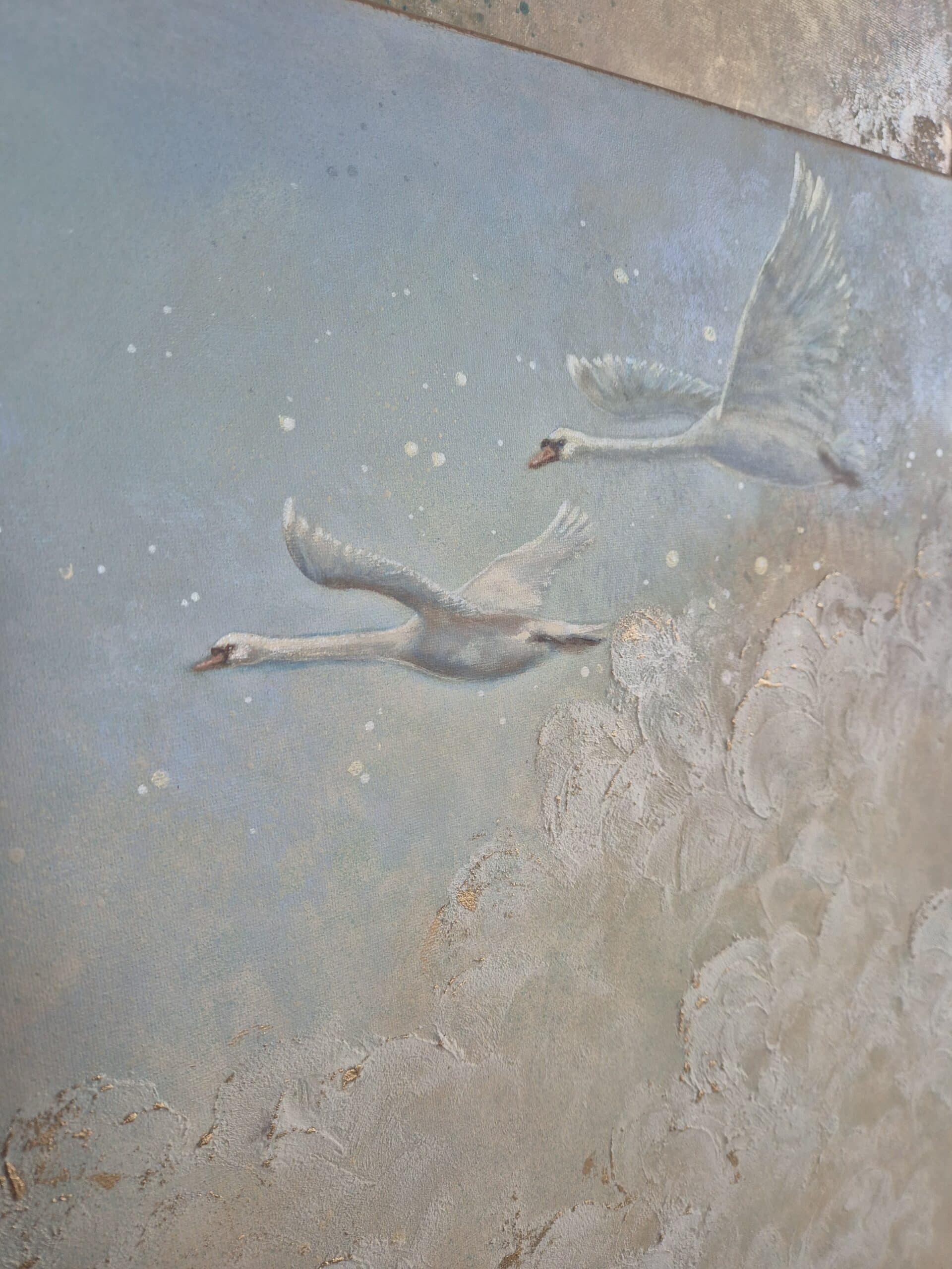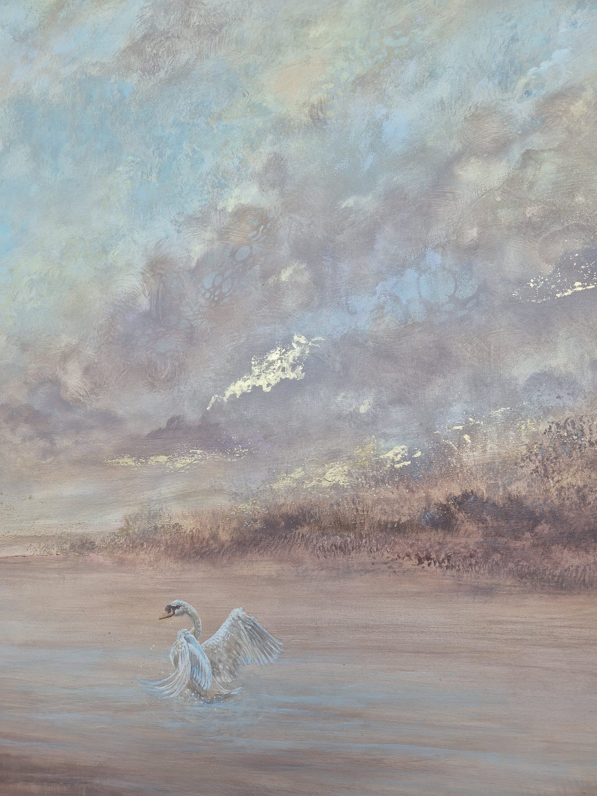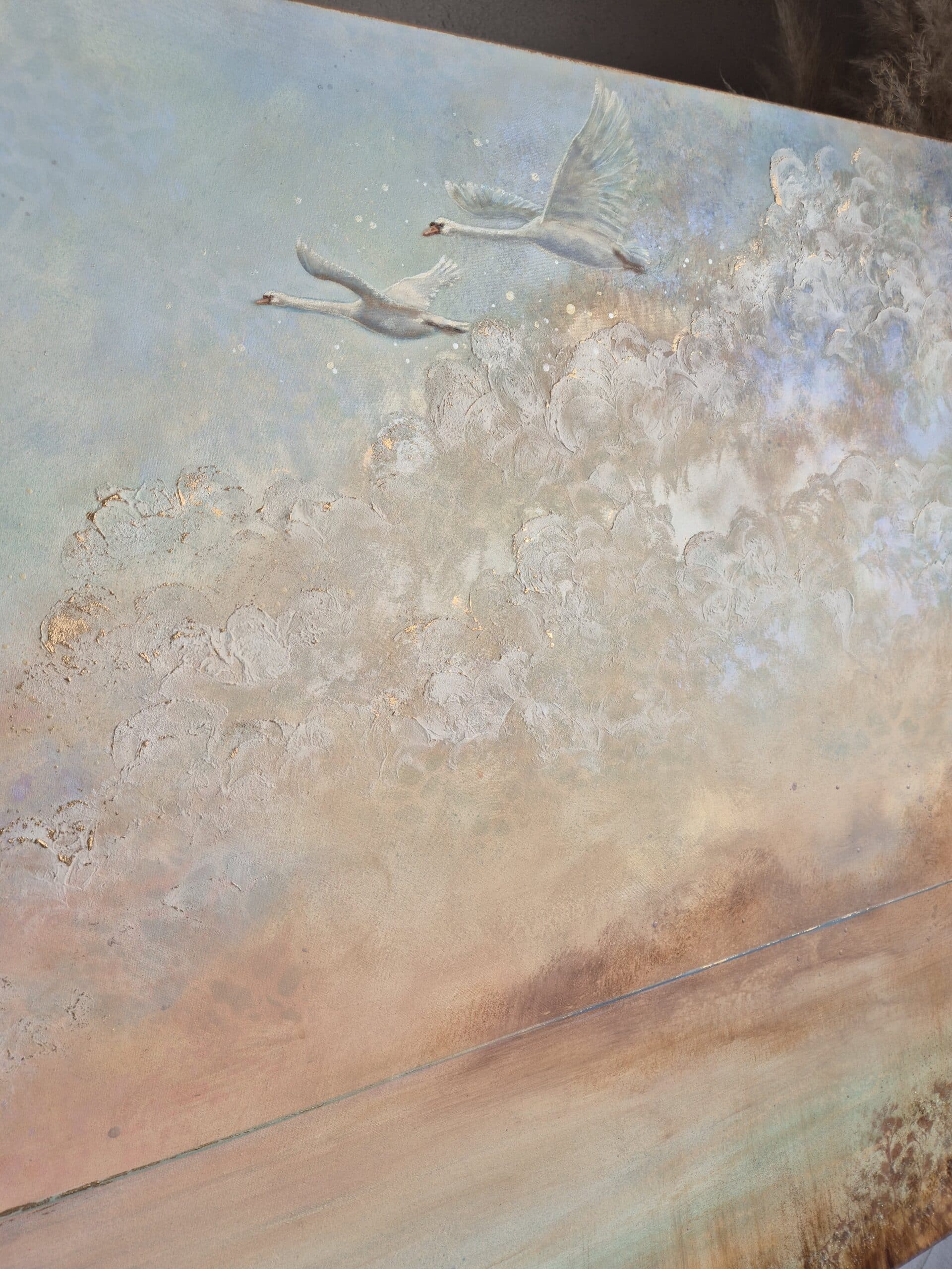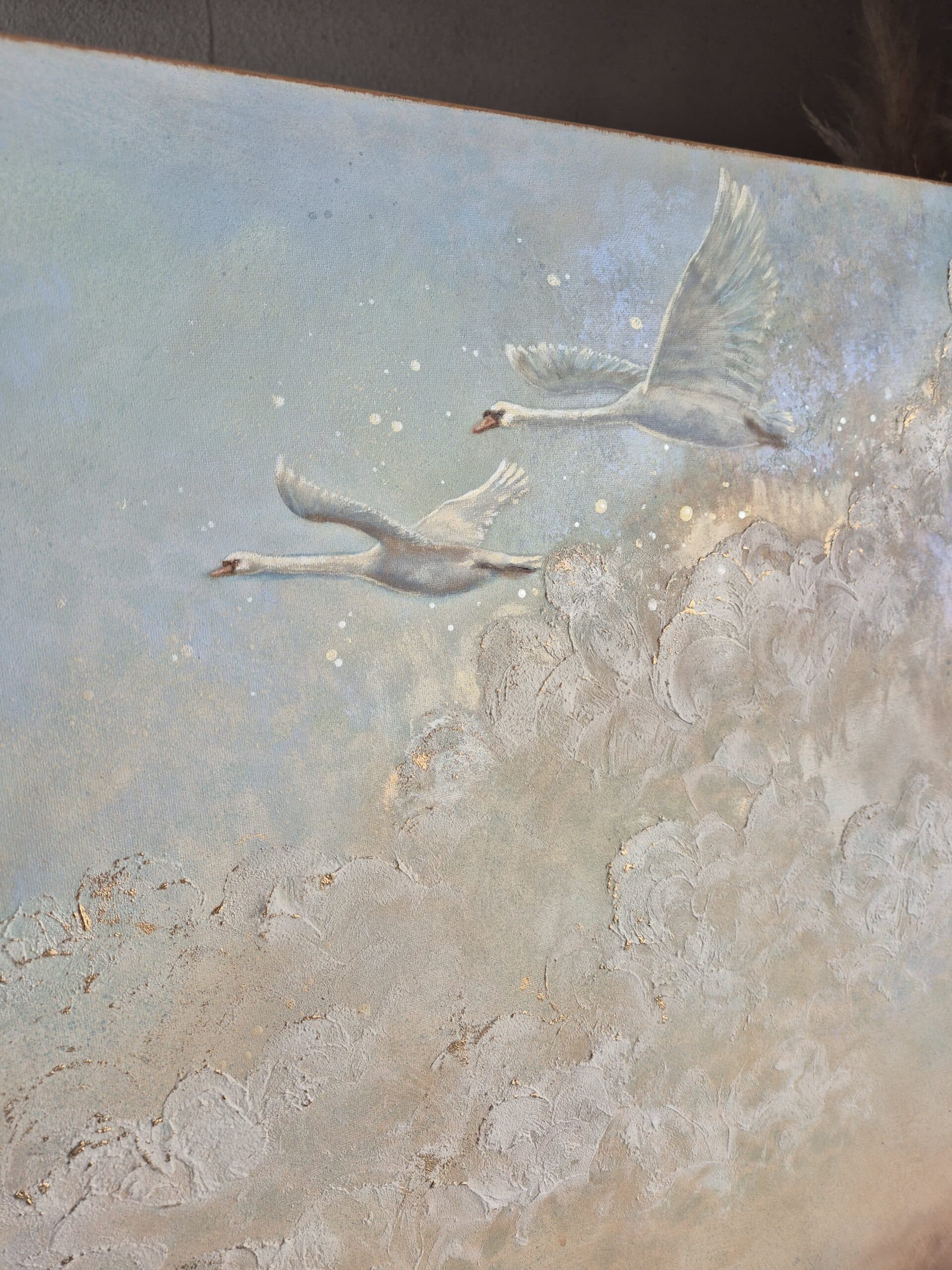 Værket er et levende svanemaleri, hvor de lysreflekterende og changerende detaljer i perlemor og guld lyser op og skaber magi og liv. Disse detaljer påvirkes af lys – både sollys og hvis du tænder en lampe i rummet. Det giver et helt særligt spil og liv i det rum, du placerer maleriet og skaber en masse magiske øjeblikke i løbet af dagen såvel som i aftentimerne.