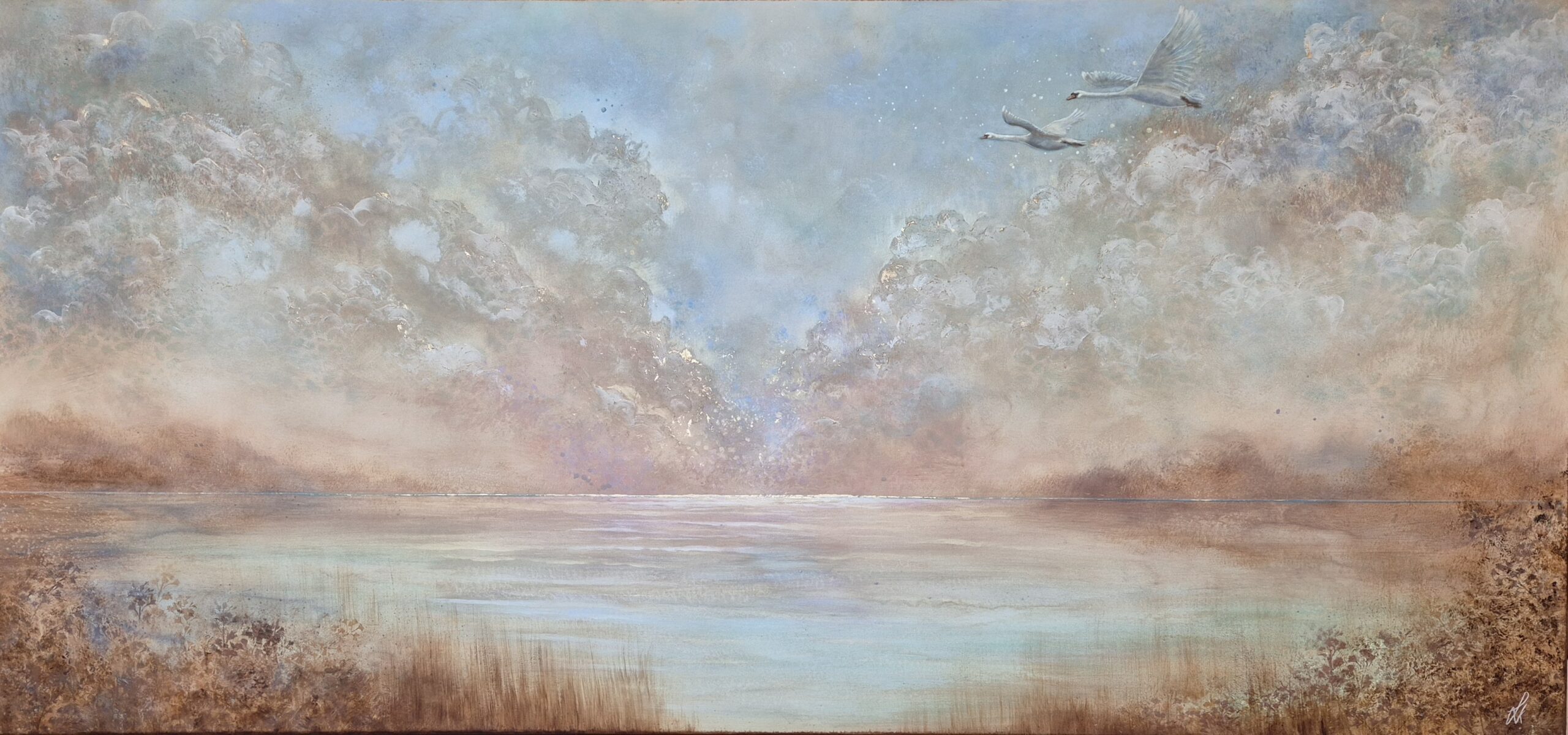 Maleriet er inspireret af alle de uhyrsmukke og eventyrlige solnedgange her ved fjorden, som jeg kan se fra atelieret og galleriet. Dagligt kommer der svaner svømmende og flyvende forbi og jeg er så fascineret af disse yndefulde skabninger, at jeg bliver nødt til at male dem. Derudover symboliserer svaner blandt andet styrke, lys, ro og indre skønhed. Symbolikken hænger derfor så fint sammen med mine levende landskabsmalerier og hvad jeg ønsker at give videre med min kunst.