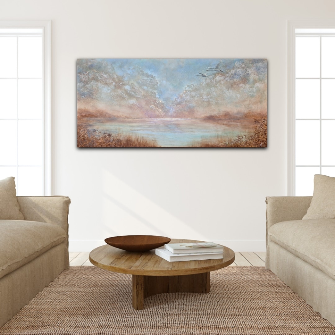 “Wings of Serenity” er et levende, lysende og stemningssættende svanemaleri. Det bringer naturen indenfor og skaber en fredfyldt og rolig atmosfære i hjemmet.