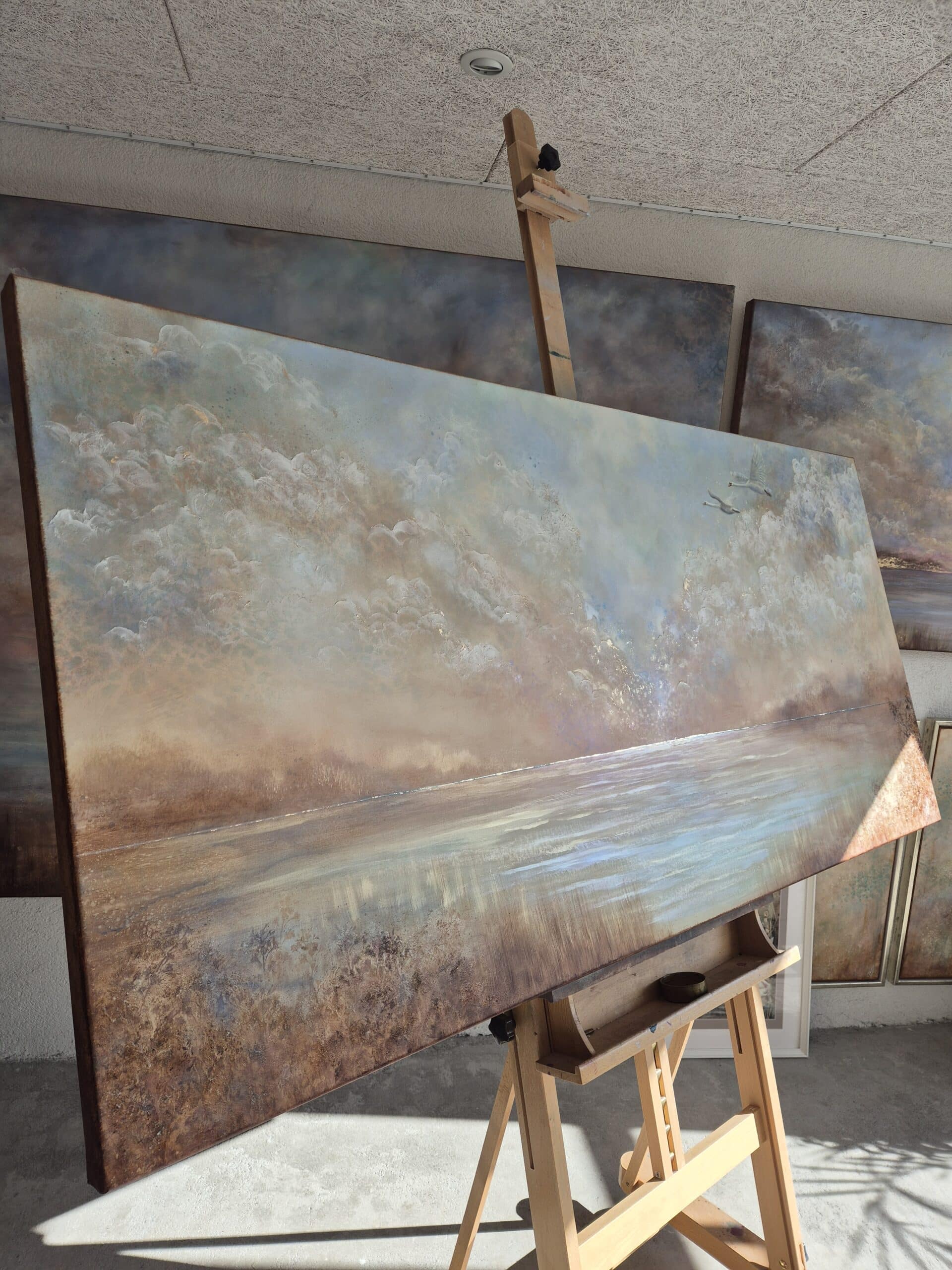 At maleriet, for mig, både skaber ro, byder på fordybelse og eventyr, skyldes, at værket ændrer karaktér og udtryk i løbet af dagen – præcis som de smukke himle jeg er så betaget af. Det magiske univers, jeg forsøger at skabe og bringe indenfor hos mine kunder, bliver helt tydelig, når lys rammer de changerende og lysreflekterende effekter fra forskellige vinkler. For mig gør det et maleri som dette magisk og levende. Det minder os om lige at stoppe op, trække vejret og nyde nuet.”