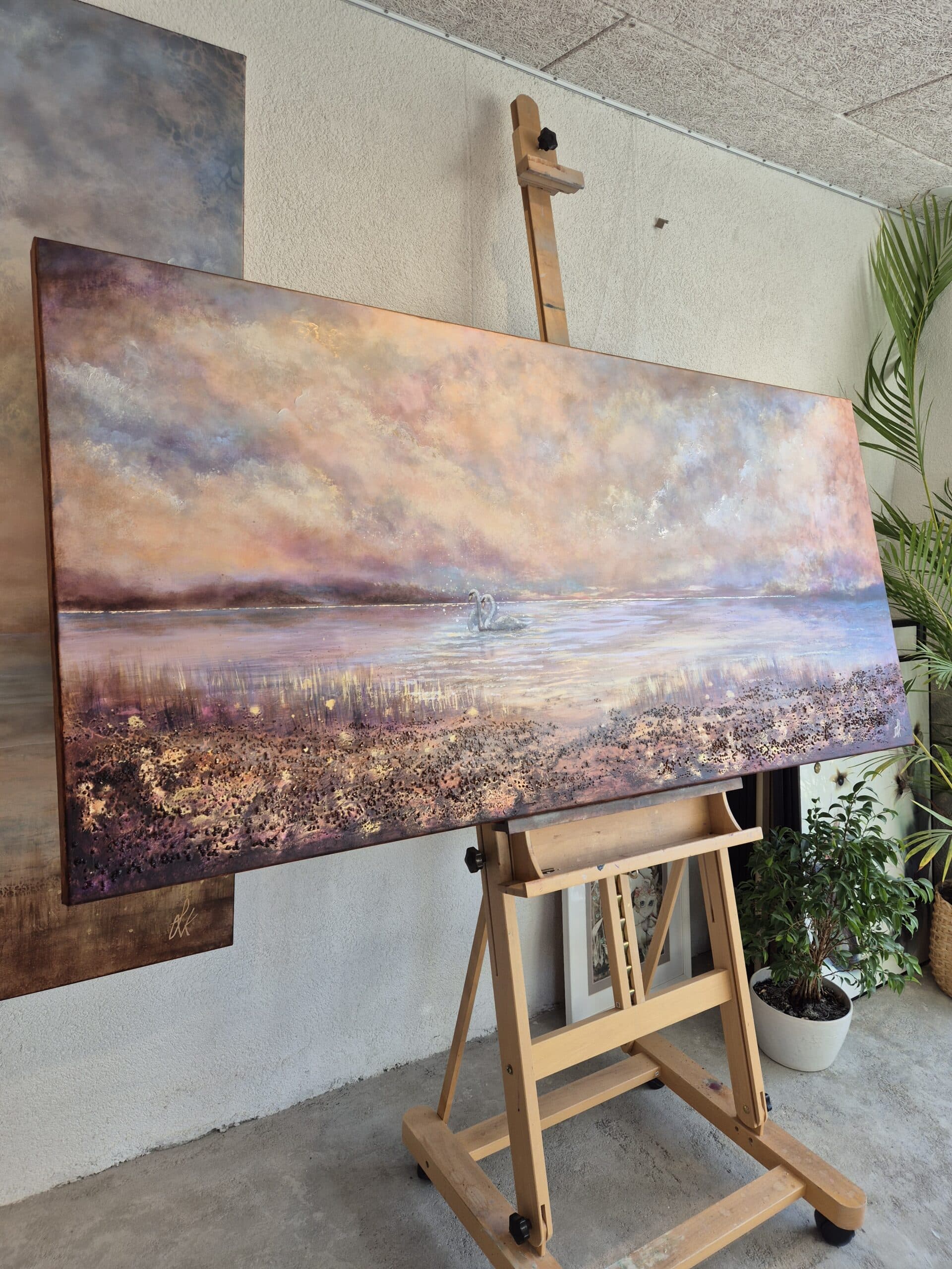 “Moments” er et levende svanemaleri, hvor de lysreflekterende og changerende detaljer i perlemor og guld lyser op og skaber magi og liv i dit hjem. Du er altid velkommen til at bestille tid til en fremvisning i galleriet i Kerteminde, hvor du kan se alle de magiske detaljer blive bragt til live.