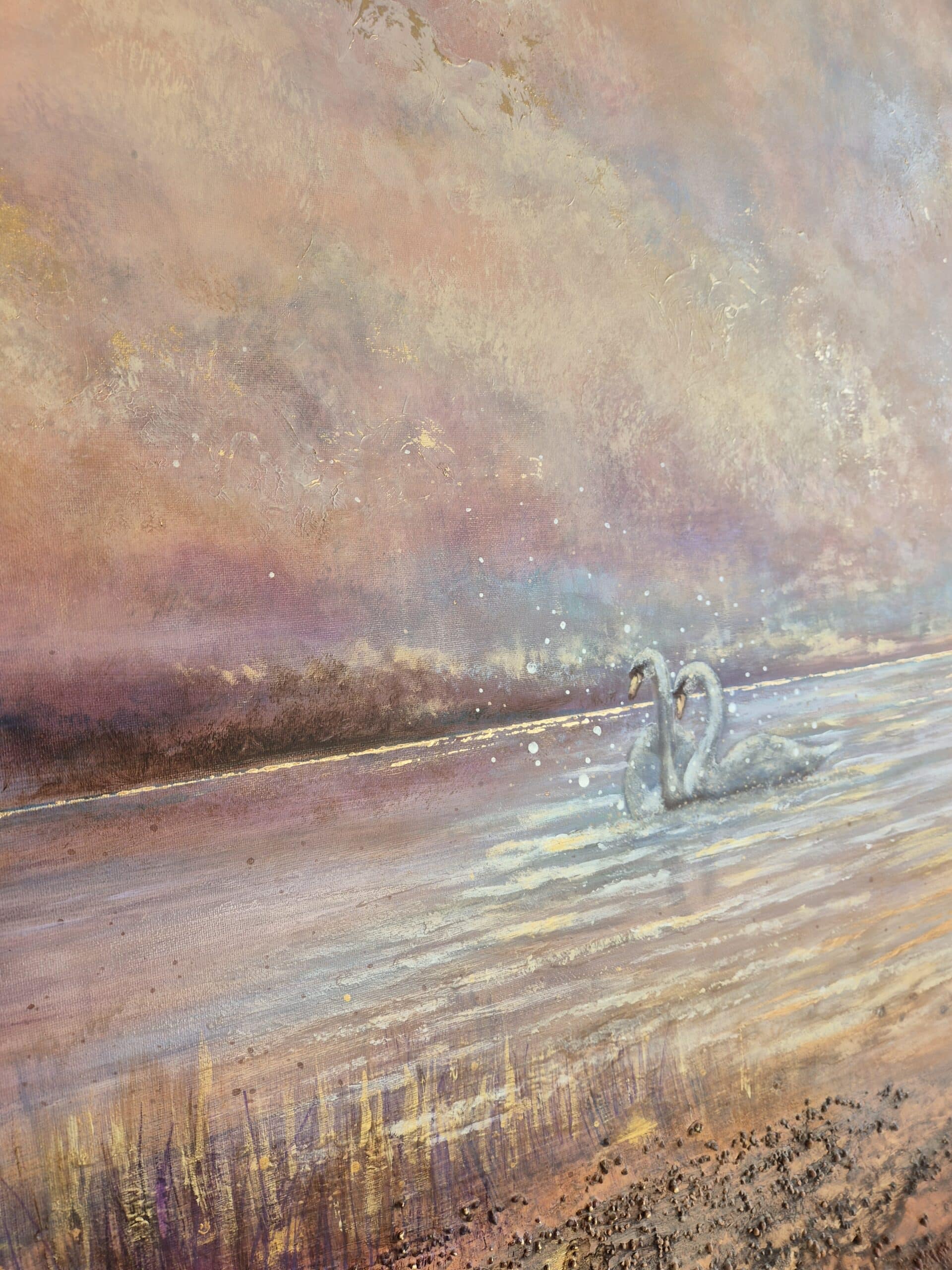 “Moments” er et levende svanemaleri, hvor de lysreflekterende og changerende detaljer i perlemor og guld lyser op og skaber magi og liv.