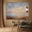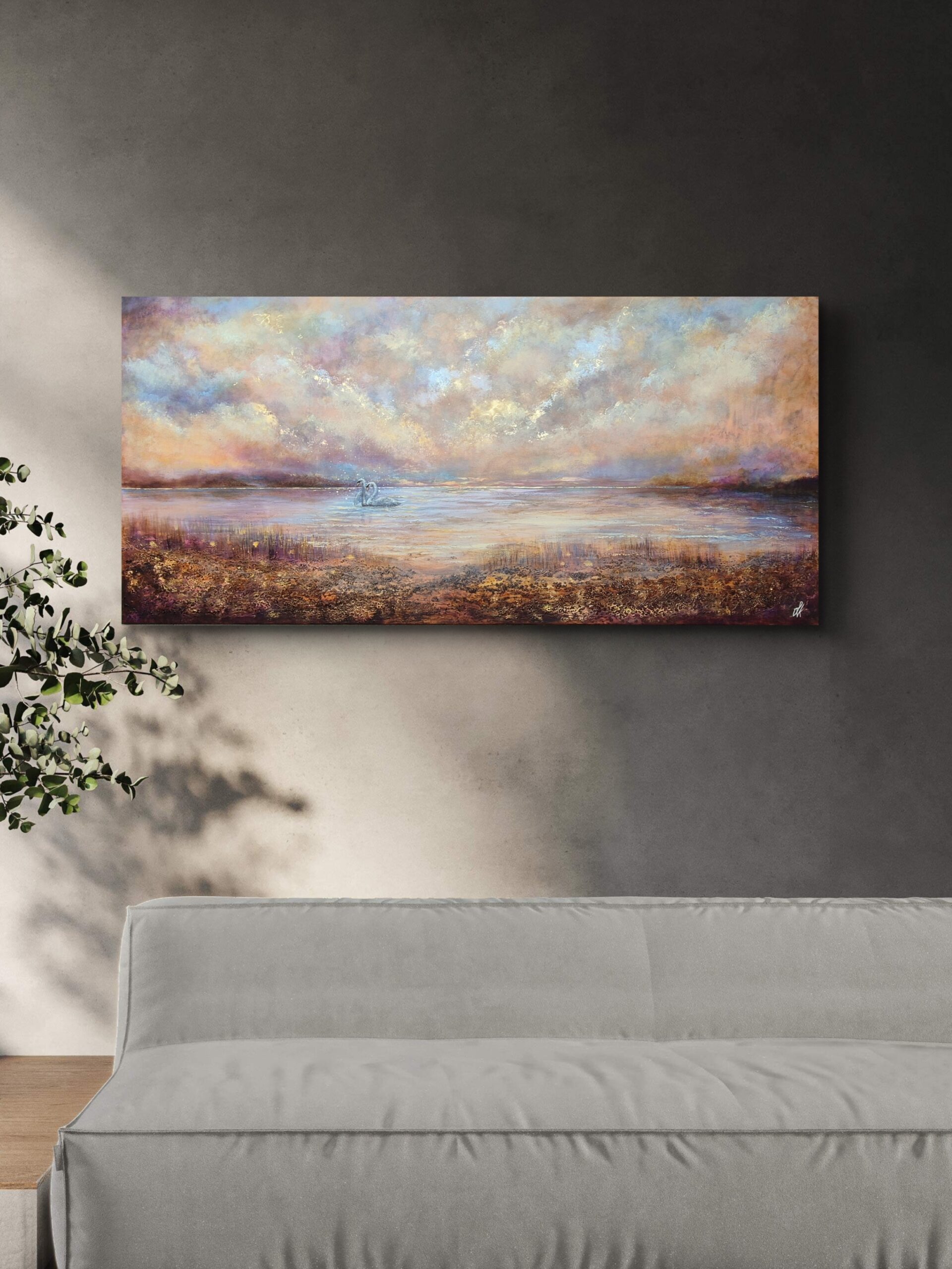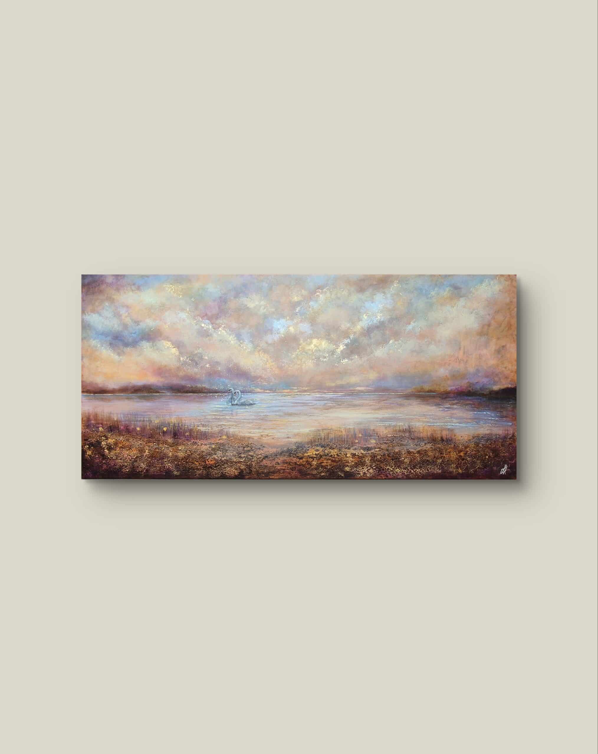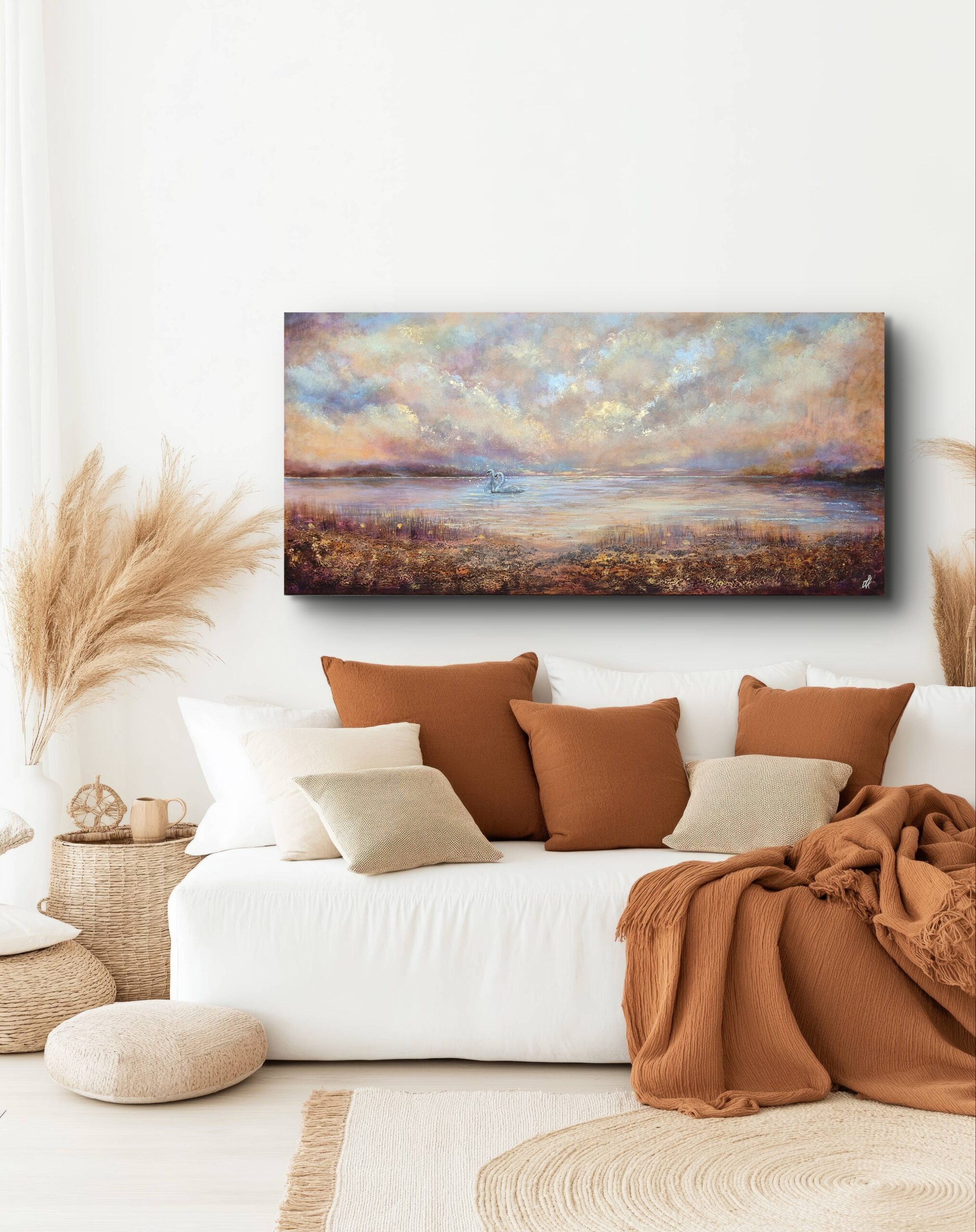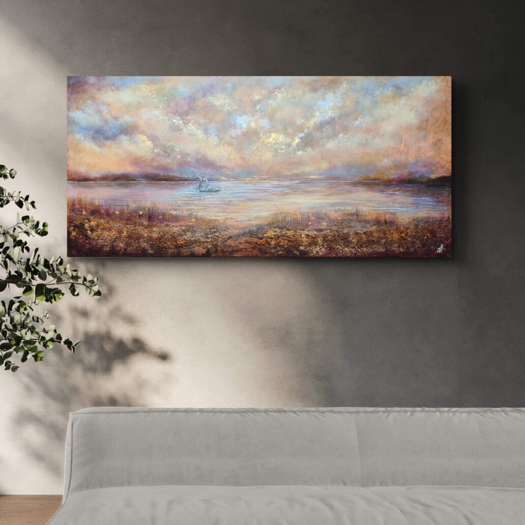 “Moments” er et stort, liggende svanemaleri i harmoniske farver, der skaber god energi og ro i indretningen samtidig med at det inviterer dig med på eventyr.