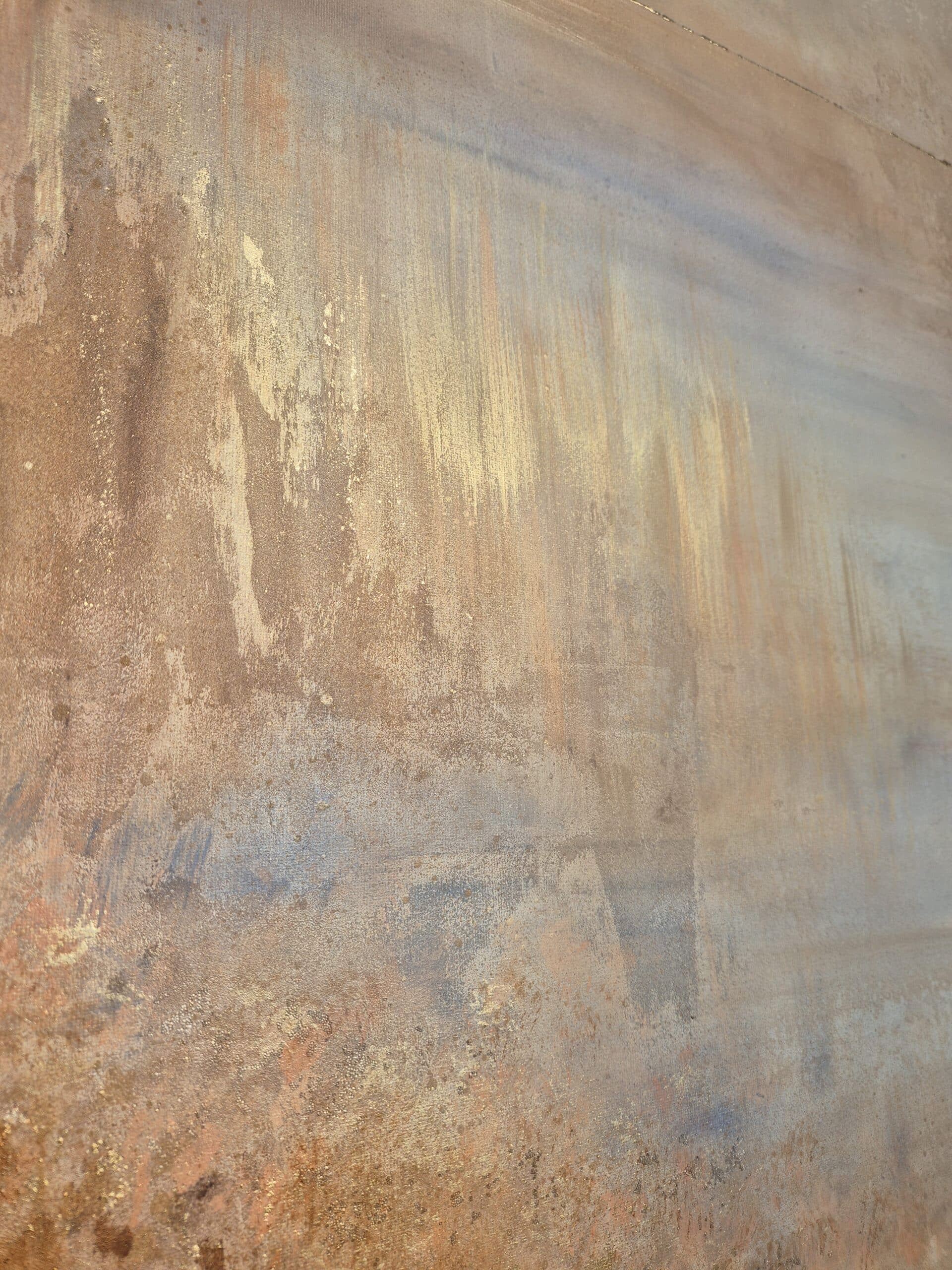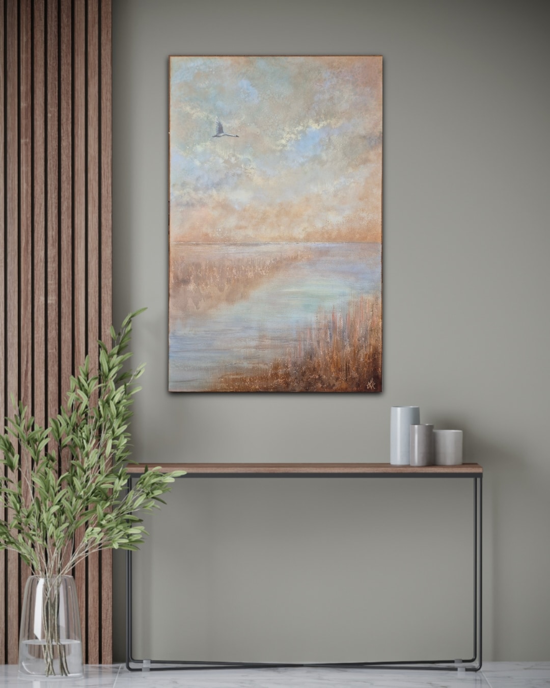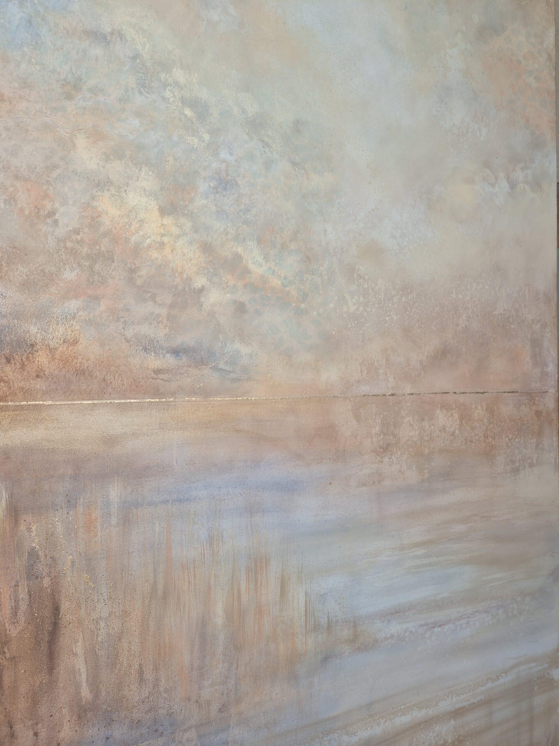 “Jeg tiltrækkes både af et dynamisk og roligt udtryk. Disse kontraster forsøger jeg at komme omkring, ved at skabe, hvad jeg kalder “Levende værker”. At maleriet, for mig, både skaber ro, byder på fordybelse og eventyr, skyldes, at værket ændrer karaktér og udtryk i løbet af dagen, når lys rammer de changerende effekter fra forskellige vinkler. For mig gør det et maleri som dette magisk og levende. Det minder os om lige at stoppe op og nyde nuet”.
