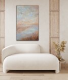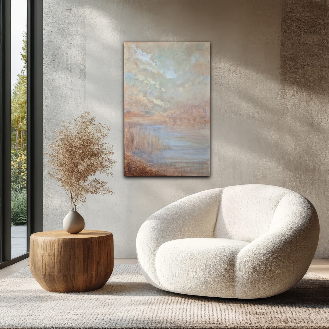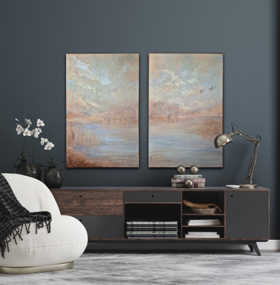 De harmoniske, lysende og rolige landskabsmalerier skaber uendelige magiske øjeblikke med alle de lysreflekterende og changerende detaljer i guld og perlemor. Når lyset rammer eller du tænder en lampe, opstår magien og de fine detaljer begynder at danse på lærredet. Forbered dig på at opdag nye lag i malerierne hver dag.